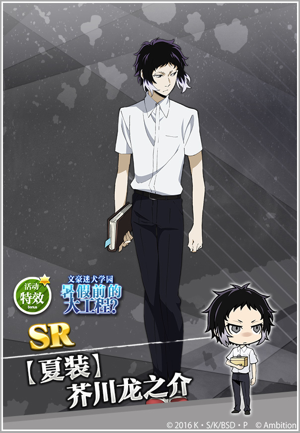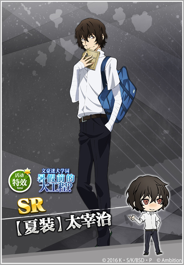 本次活动的最后一张SR就是这张【夏装】太宰治了,担任“武装学生会”会长的他似乎每天都不怎么管事情,反而是在研究怎样自杀。单手插袋、眼神狡黠的他可能又在构思新的手法……