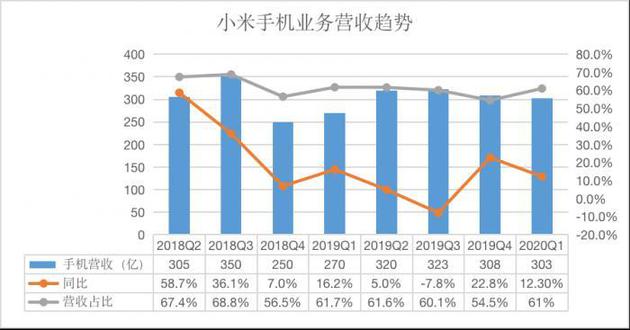 但从资本市场的反馈来看,小米并没有说服市场。因为从实际情况来看,小米依然很依赖手机业务,今年一季度,小米的总收入为497.02亿元,其中智能手机业务收入为303亿元,占比为61%。在小米上市的两年中,智能手机的占比虽然呈现出一定的下降趋势,但仍然超五成。