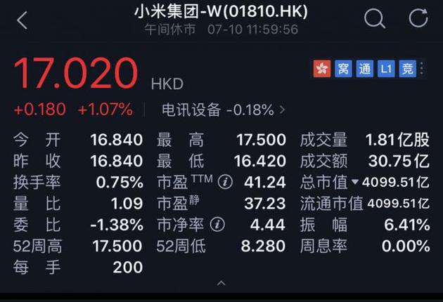 7月10日,在经过连续几日的上涨之后,小米集团的股价时隔两年重新站上了17港元/股。截至午间休市,小米股价为17.02港元/股,总市值约为529亿美元。