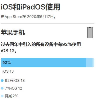 相对的,另一位生态巨头苹果于 2019 年 9 月 20 日发布了 iOS 13 版本更新。据苹果开发者网站数据,截至 2020 年 6 月 17 日已有 92%的 iPhone、总共 81% 的苹果设备设备运行在 iOS 13 系统上。