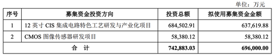 对于此次募集资金的用途,招股书披露到,主要的金额会用在 12 英寸 CIS 项目上,拟使用约 63.8 亿人民币,CMOS 研发项目拟使用约 5.8 亿人民币。