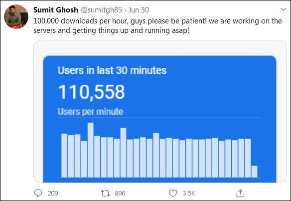 此次中国应用被禁,尽管这些应用看似迎来“春天”,但问题却已经显现。6月30日,苏米特·戈什还发推特称,下载热情太高,服务器不堪重负:“每小时下载10万,请耐心等待!我们正在调试服务器,会尽快启动并运行!”