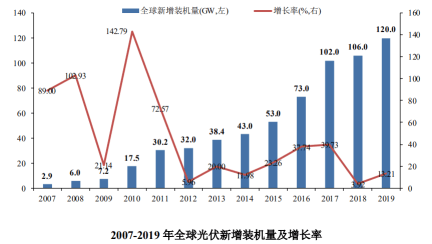 从全球光伏新装机量来看,安信证券研报显示,2007-2019年,除2012年受贸易摩擦和2018年受光伏政策影响增速放缓外,其余年份均保持高于10%的同比增长率。2018年度,全球新增光伏装机容量达到106GW,自2011年以来的年均复合增长率高达38.56%。