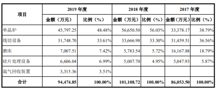 除单晶炉和线切设备外,磨床和硅片处理设备在2019年占收入的比重同比有一定幅度的增加;同时,氩气回收装臵为其2019年新增业务,应用于单晶炉拉晶过程中对消耗的氩气进行回收。