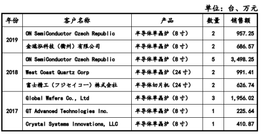 稳步拓展国内市场的同时,公司积极实施战略结构调整,由光伏行业向半导体行业进一步延伸。公司公告显示,报告期内,连城数控与 ON SemiConductor Czech Republic(安森美半导体的捷克制造工厂)、Global Wafers Co., Ltd(台湾环球晶圆)、金瑞泓科技(衢州)有限公司、West Coast Quartz Corp、富士精工(フジセイコー)株式会社等业内知名企业建立合作关系,对其销售情况如下表所示: