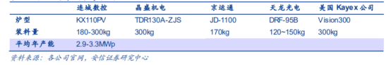 连城数控就是半导体硅生长设备单晶炉的重要提供商。公司在单晶炉、晶棒截断、金刚线切片等装备领域的研发能力处于领先地位,取得了良好的经营业绩。通过对比分析各公司单晶炉参数,连城数控在装料量、热场尺寸等方面业内领先。各公司单晶炉参数对比如下: