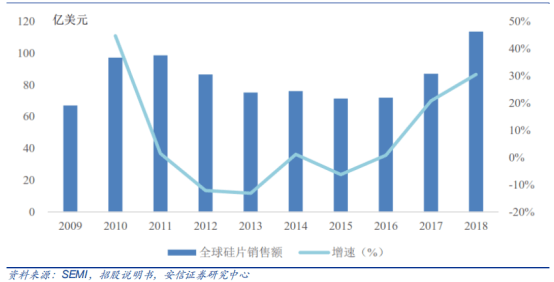 2017年以来,受益于半导体终端市场需求强劲,下游传统应用领域计算机、移动通信、固态硬盘、工业电子市场持续增长,新兴应用领域如人工智能、区块链、物联网、汽车电子的快速发展,半导体硅片市场逐渐复苏,市场规模开始上升。全球半导体硅片(不包括SOI硅片)市场规模如下图所示: