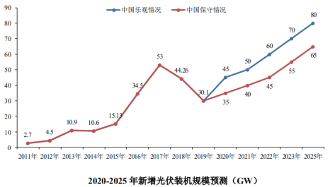 2020年,在未建成的2019年竞价项目、特高压项目,加上新增竞价项目、平价项目等拉动下,预计国内新增光伏市场将恢复性增长。“十四五”期间,随着应用市场多样化以及电力市场化交易、“隔墙售电”的开展,新增光伏装机将稳步上升。