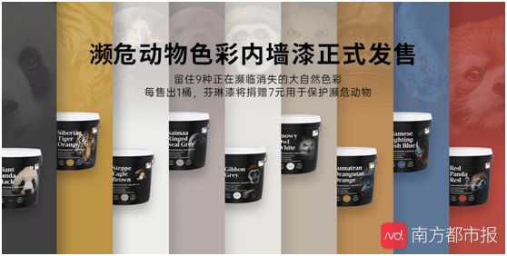 “健康和可持续发展”也被迪古里拉集团定为2020年企业战略发展方向。为了留住地球上濒危灭绝的物种,保护濒临消失的色彩,在7月8日一场名为“新旗舰,新起航”的新品发布会上,芬琳漆推出9款濒危动物内墙漆,包括大熊猫黑、西伯利亚虎橙、雪鸮白、泰国斗鱼蓝等9种成品色。每卖出一款该系列产品,芬琳漆将捐赠7元用于保护濒危动物。