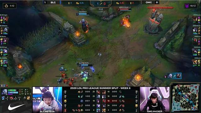 [16:20] OMG开峡谷先锋,BLG前来接团,巴德大招定到狗熊,猴子TP绕后配合狗熊进场但由于坦度不足二人率先被秒,辛德拉此时无人处理疯狂输出,但由于追击过深被艾克击杀,双方完成一波3换3