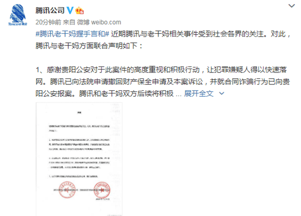 7月10日傍晚,腾讯和老干妈发布联合声明:腾讯撤回财产保全申请及本案诉讼,并已向老干妈书面致歉;同时由于此事对社会公共舆论资源造成的过多占用,双方均深表歉意。
