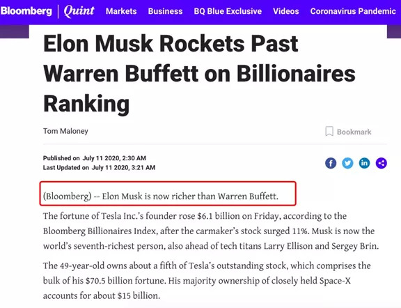 马斯克身家超越巴菲特