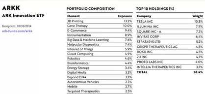 截至2020年一季度末,该ETF前五大持仓股票为特斯拉(10.5%)、生物科技公司ILLUMINA(7.9%)、电子支付系统SQUARE(7.2%)、医学遗传学公司INVITAE CORP(6.4%)、3D打印公司STRATASYS(5.2%)。