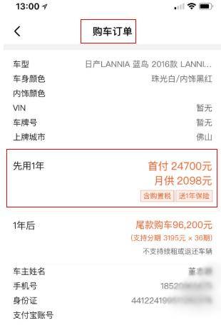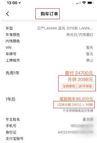 客户在系统上看到的订单信息,刚开始是显示“购车订单”,而且出现了“首付”、“月供”等字眼。看到这些信息,我们正常的思维都会觉得这是在买车,而非租车。