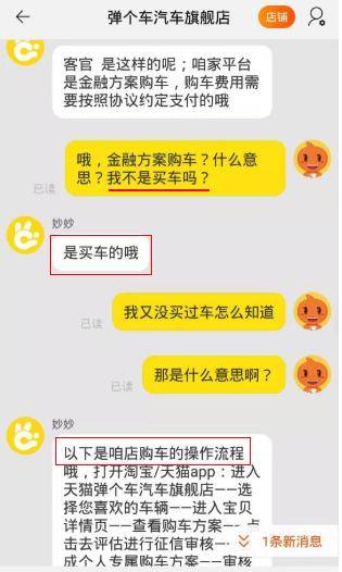 弹个车在天猫上有旗舰店,旗舰店的客服,也告诉客户是买车。正如下面这个对话,消费者问:“金融方案购车?什么意思?我不是买车吗?”客服回答说:是买车哦。