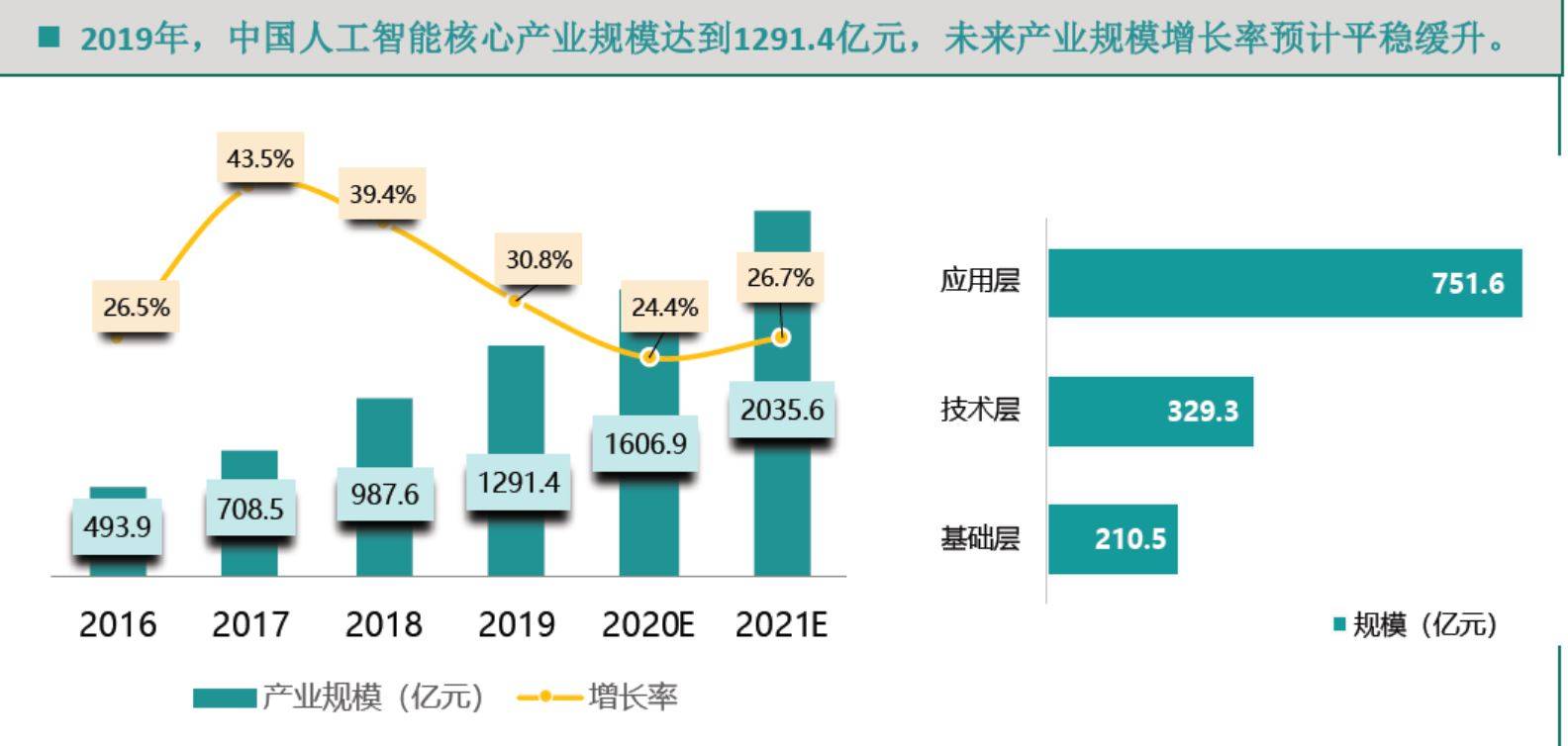 经历全球人工智能爆发增长阶段,至2019年,中国人工智能产业逐渐趋于稳定,产业模式探索已基本完成,产业焦点从技术驱动转向多元化的场景应用和行业中的深度融合。中国人工智能正逐渐离开高增长率的成长期,驶向产业的成熟阶段。2019年,中国人工智能产业规模达到1291.4亿元,产业初具规模,同比增速为30.8%,相比2017年高增长时期的43.5%有所降低。