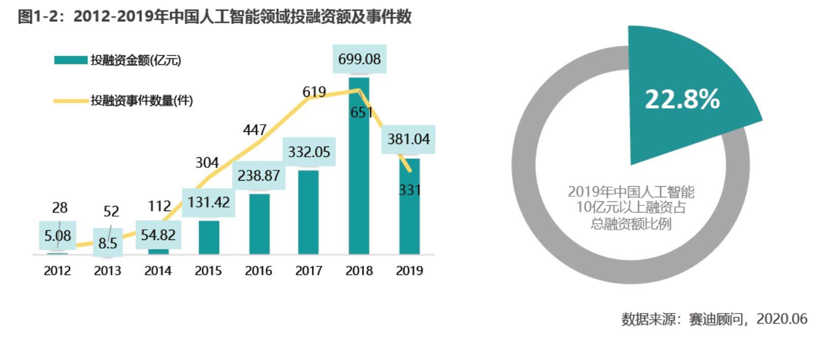 2012年开始,人工智能行业投融资资金规模呈现指数型增长态势,大量的资本涌入人工智能行业。2019年中国人工智能行业的投融资总金额伴随人工智能领域投融资数量下滑而急剧缩减,2019年中国人工智能投融资总金额为381.04亿元,仅为2018年投融资总金额的54.5%。