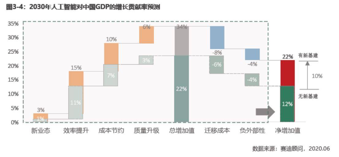 赛迪顾问表示,数字经济规模占中国总GDP比重不断增加,在考虑到新基建的影响后,预计2030年人工智能产业将对经济增长产生约10%的利好影响。