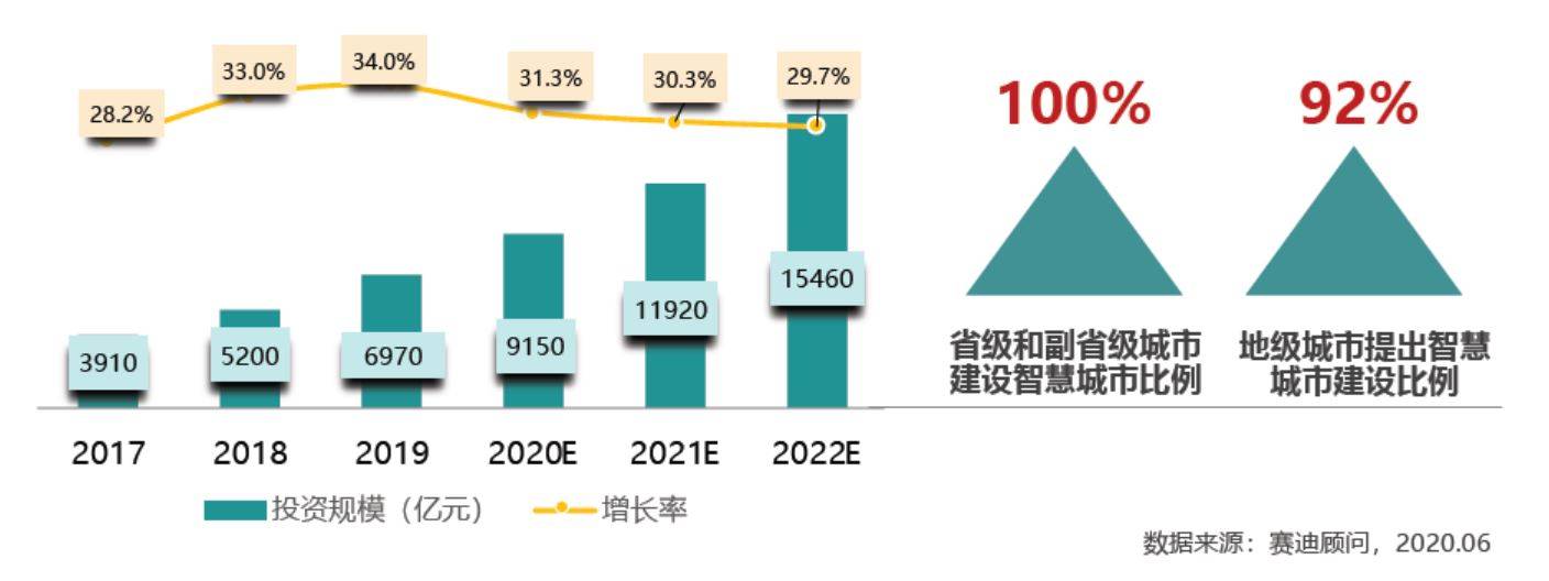 中国新型智慧城市IT投资规模(亿元)及增速;数据来源:赛迪顾问,2020.06