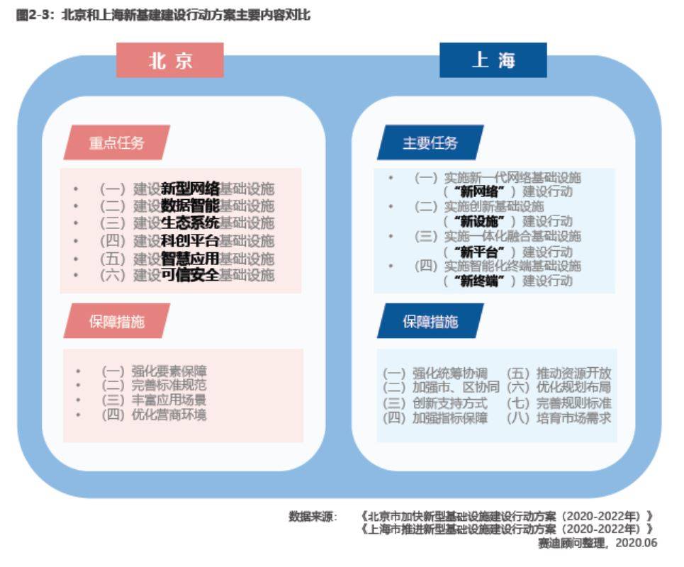 北京和上海率先推出新型基础设施行动方案,在顺应区域发展战略,依托当地资源基础的同时,重点以网络、科技创新和智慧应用为建设重点。同时行动方案中明确资源要素、市场环境、标准规范等方面的保障措施。