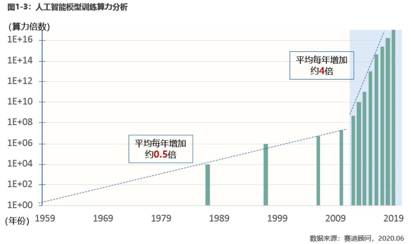 以1959年神经网络诞生时所需要的算力为基准,2012年AlexNet模型所需的算力已经是1959年模型的一亿倍,平均每年需要增加0.5倍的算力以满足新模型的计算需求。而在2012年后,深度学习算法的演化进入新阶段,计算能力需求为平均每年增加4倍。全新的算法在提升人工智能性能的同时需要更为庞大的计算能力作为支撑。