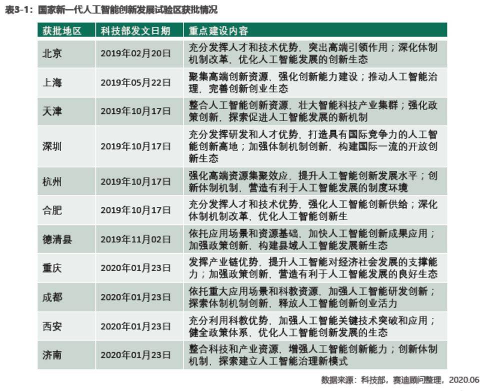 AI新基建的建设重点中,以人工智能为核心支点的人工智能试验区是推动产业发展的关键一环。2019年8月,科技部制定并发布《国家新一代人工智能创新发展试验区建设工作指引》,以推动人工智能创新发展试验区的建设。