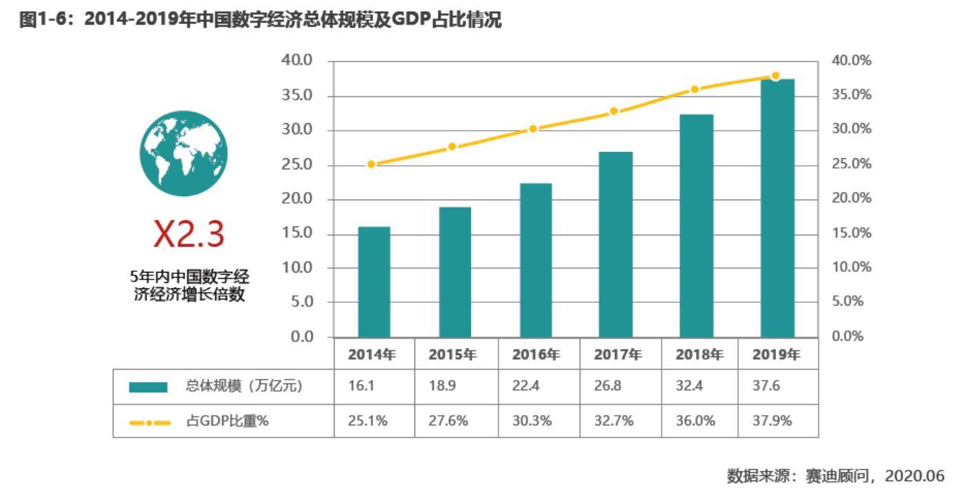 从1994年中国正式接入互联网,中国开启数字化加速进程。截至2019年,中国网民已经达到8.5亿人,移动互联网月活跃终端13.47亿台。数字经济已经成为中国经济发展不可或缺的重要组成。2014年至2019年,中国数字经济总体规模持续增长,且数字经济规模占中国总GDP比重不断增加,数字化体系建设将打