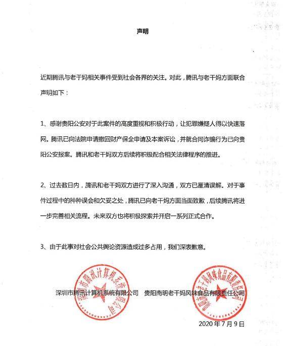 7月10日,腾讯发表声明称,已向法院申请撤回财产保全申请及本案诉讼,并就合同诈骗行为已向贵阳公安报案。