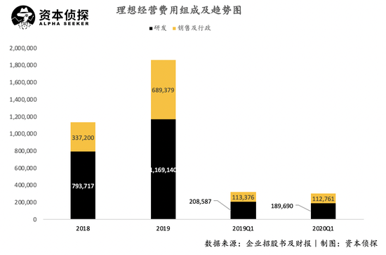具体来看,根据招股书显示,在理想ONE开始量产之后,理想的经营费用下降。2019年全年,理想的经营费用总额为18.6亿元人民币,其中研发费用为11.7亿人民币;2020年Q1的的经营费用为3亿元人民币,经营费用率为35.5%,其中研发费率为22%。主要原因在于2019年理想ONE量产前产生了大笔的批准确认及测试费用。