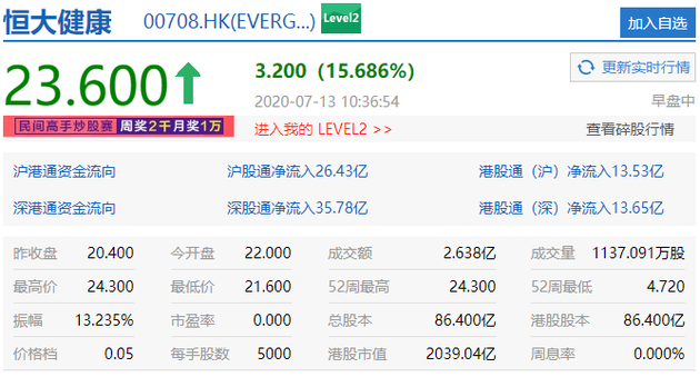 新浪港股讯 7月13日消息,恒大健康涨幅扩大至15%,市值突破2000亿港元大关,最新市值2009亿港元,本月暴涨123%。