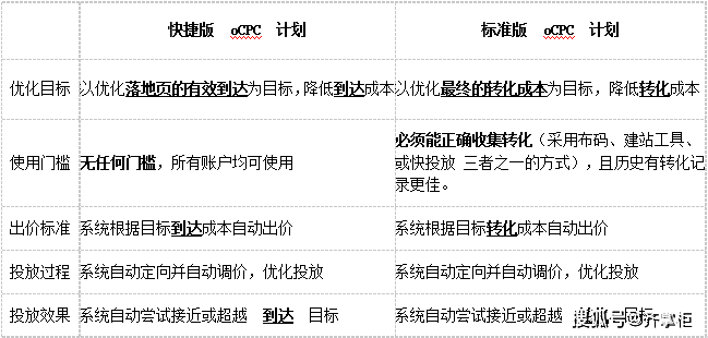 快捷版 oCPC 计划 与 标准版 oCPC 计划 的区别