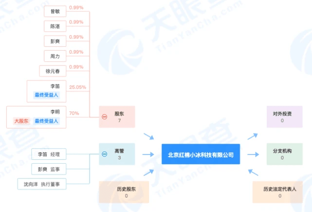 据天眼查数据显示,北京红棉小冰科技有限公司注册资本100万人民币,于2020年5月20日成立。李笛为法定代表人,第一大股东为李明持股70%,第二大股东为李笛持股为25.05%。