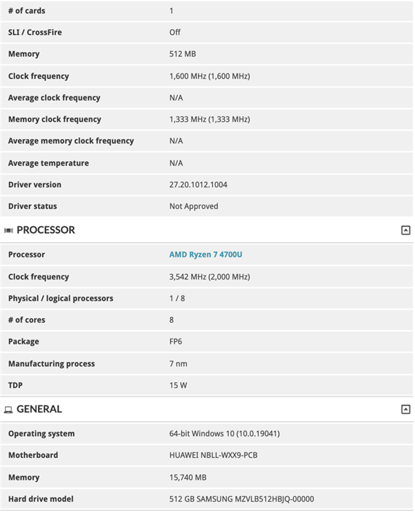 该机搭载的是AMD锐龙7 4700U处理器、DDR4-2666内存、三星512GB SSD。
