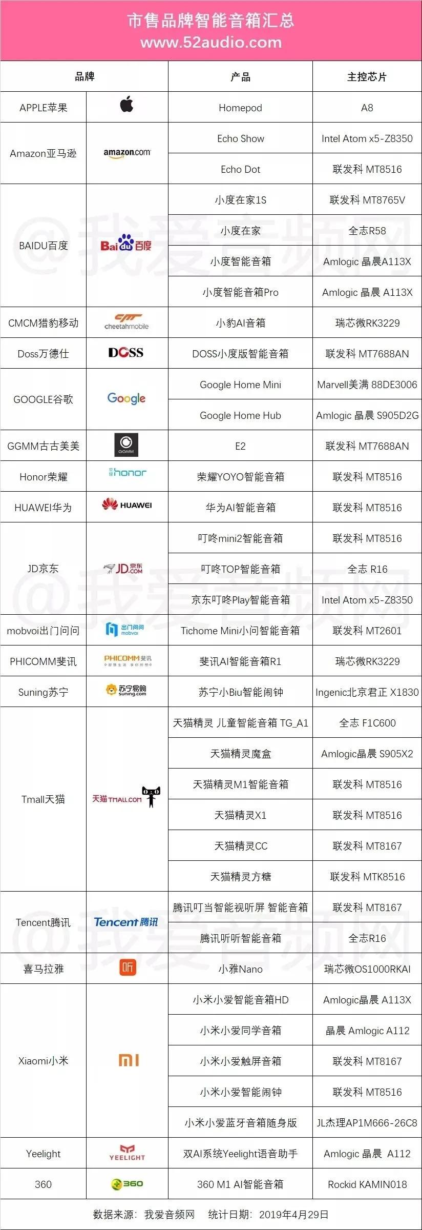市面上主流智能音箱芯片方案,表格来源:我爱音频网