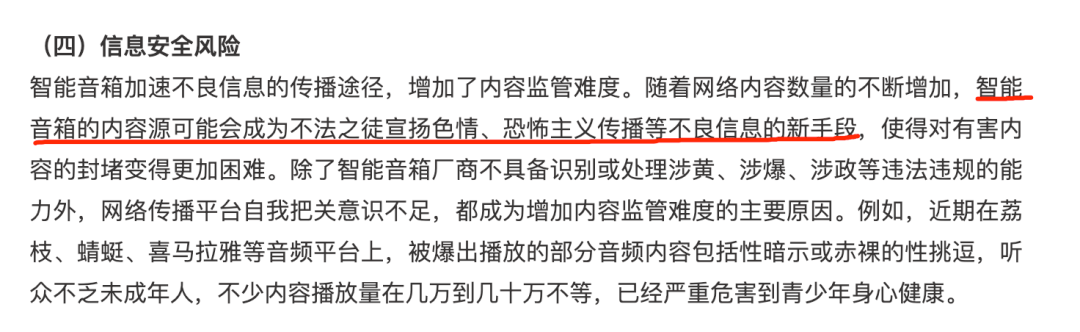 中国信通院曾在一份报告中表达了这样的担忧,智能音箱加速不良信息的传播途径,内容源可能会成为不法之徒宣扬色情、恐怖主义传播等不良信息的新手段。