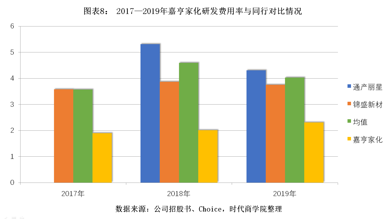时代商学院翻阅资料后发现,嘉亨家化报告期内的研发费用率与同行可比公司相差近50%。招股书显示,该公司2017—2019年的研发费用分别为1006.1万元、1441.73万元、1816.86万元,占各期营业收入的比例分别为1.89%、2.01%、2.31%。通产丽星(002243.SZ)、锦盛新材(300849.SZ)作为该公司的可比竞争对手,报告期内的研发费用率均值分别为3.57%(2017年通产丽星未公布研发费用数据)、4.59%、4.03%。