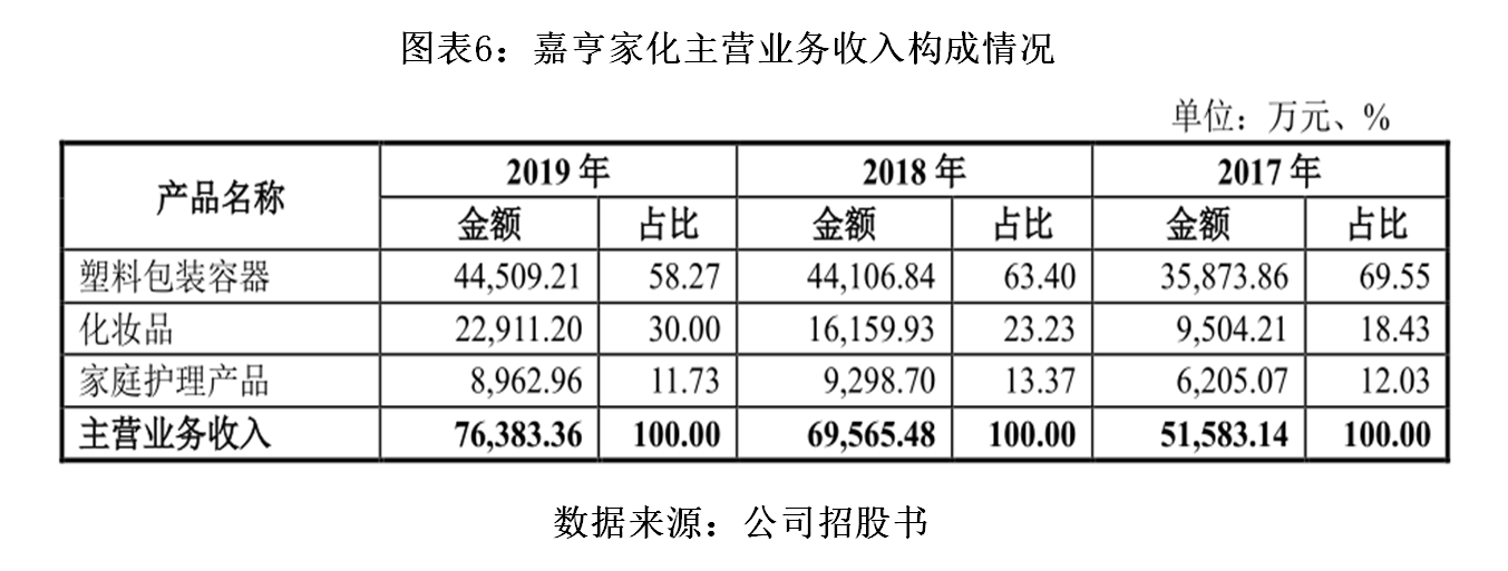 按收入构成看,嘉亨家化主要收入来源于塑料包装容器、化妆品业务。报告期内,嘉亨家化塑料包装容器的销售收入占比分别为69.55%、63.4%、58.27%;化妆品销售收入占比分别为18.3%、23.23%、30%,上述两类产品的销售占比超8成。