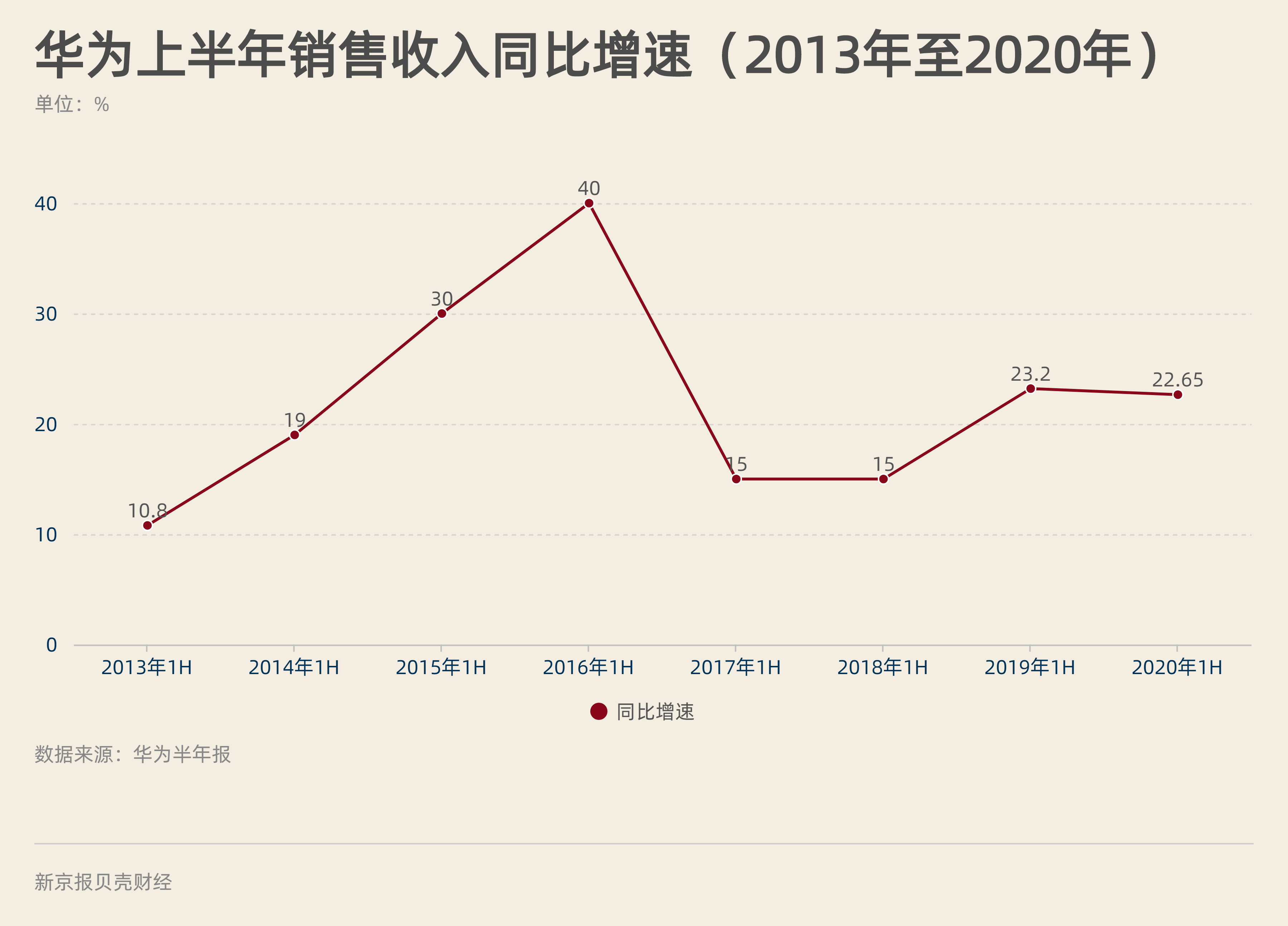 新冠疫情对华为一季度的业绩有明显影响,不过今年上半年公司的销售收入增速未出现大幅下降,反而保持平稳。去年上半年华为的销售收入同比增长23.2%,今年上半年这一数字为22.65%,公司继续保持正增长。