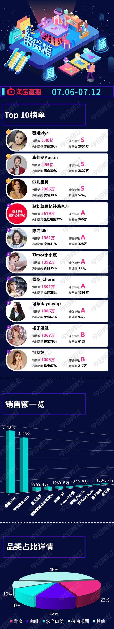 带货榜:本周,淘宝“薇娅viya”总销售额达5.48亿元,李佳琦则以4.95亿销售额居第二,两人共推动淘宝榜总额达到11.78亿元。