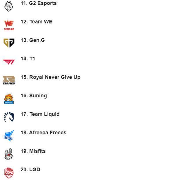 除了前十名之外,剩下的LPL队伍排名是WE第十二名,RNG第十五名,SN第十六名,LGD第二十名,VG第二十一名,EDG第二十六名,BLG第三十六名,DMO第三十七名,estar第三十八名,LNG第三十九名,OMG第四十名,RW第四十六名。