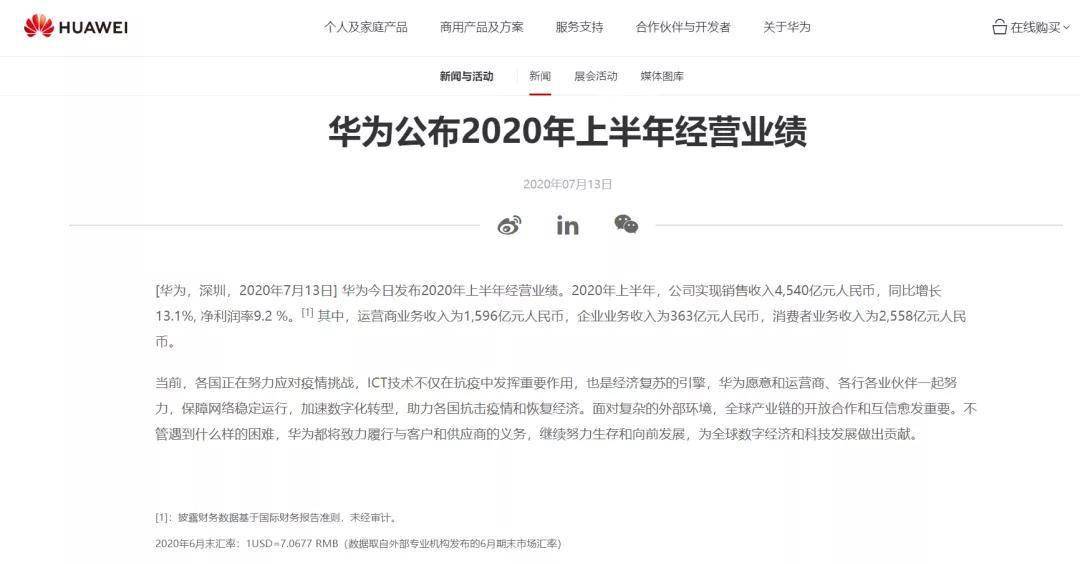 13日深夜,华为官网发布2020年上半年经营业绩。2020年上半年,公司实现销售收入4540亿元人民币,同比增长13.1%,净利润率9.2%。其中,运营商业务收入为1596亿元人民币,企业业务收入为363亿元人民币,消费者业务收入为2558亿元人民币。