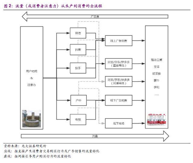 光大证券分析称,在目前的互联网产品谱系中,微信、快手、抖音等社交内容平台具备显著的多边网络效应,因此占有大量用户时长及流量,阿里、京东等电商平台在流量生产端从不具备任何优势,但却在流量的变现效率方面显著超越了其他社交及内容平台。整个互联网行业的用户时长及注意力像河流一样从微信、抖音等"水源地"通过直接或间接的方式流向阿里、京东等"水电站",从而完成流量变现的全过程。