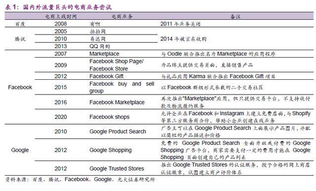 对于近期流量平台最近自建电商的动作,光大证券强调,而从历史经验上看,流量平台自建电商以完成交易闭环无一成功。即便在美国市场,全球流量霸主的Facebook和Google在自建电商平台方面同样经历了一定的挫折。