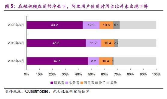 对于市场所担心的短视频流量平台崛起严重威胁了阿里的流量获取能力。光大证券认为,阿里从来就不是互联网行业的流量生产源头,而是最高效的流量变现器。用户时间及注意力从腾讯转向字节/快手,更有利于阿里对上游流量的承接与变现。
