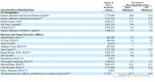 IPO前,Versant Venture Capital持股为18%, Polaris Partners持股为15.1%,Roche Finance Ltd持股为14.5%;