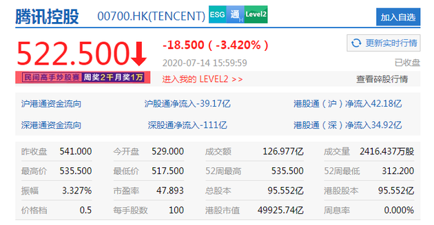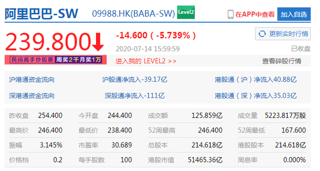 7月14日下午消息,港股恒生指数收跌1.14%,阿里京东等科技股暴跌。截至收盘,阿里巴巴跌5.7%报239.80港元,京东集团跌5.56报241.40港元,腾讯跌3.42%报522.50港元,美团点评跌4.70%报196.30港元,网易跌2.72%报146.60港元。