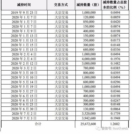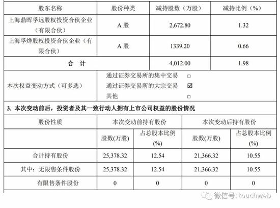 其中,上海鼎晖孚远股权投资合伙企业(有限合伙)减持2672.80万股,占公司总股本的1.32%,上海孚烨股权投资合伙企业(有限合伙)减持1339.20万股,占公司总股本的0.66%。