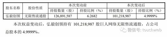 本次权益变动后,弘毅创领持有101,218,987股巨人网络无限售流通股,占公司总股本的4.9999%。保守估计,弘毅创领套现了至少4亿元。