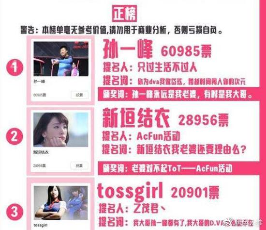 顺带一提孙哥孙一峰还勇夺A站老婆总选投票榜单榜首。以一倍的票数力压国民老婆新垣结衣,以及女帝Tossgirl,至少在DVA COS这一块上扳回一城。昔日中韩对抗赛孙哥败给Tossgirl,成为一生之耻。这次为了不让孙哥再度输给Tossgirl,一众星际老玩家费尽苦心。现如今,孙一峰不仅是他们的大哥,而且也是他们的老婆。