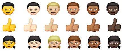 比方说, Unicode 采纳了社会上的建议,由原本单独黄颜色的 emoji 表情增加了对应不同人种肤色的表情。